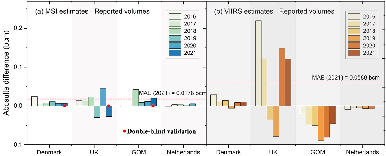 图2 离岸伴生天然气燃烧排放双盲验证。(a) 本文MSI模型估算结果与实际燃烧排放差异;(b) 已有的VIIRS VNF估算模型与实际燃烧排放数据差异。红点为2021年双盲验证结果。GOM为美国墨西哥湾