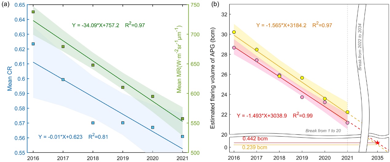 图8 (a) 2016–2021年全球离岸伴生天然气燃烧动态(蓝点:年发生频率;绿点:伴生天然气燃烧年平均辐亮度);(b) 全球离岸伴生天然气燃烧排放量估计与预测(红点:MSI估算结果;黄点:VIIRS 估算结果)