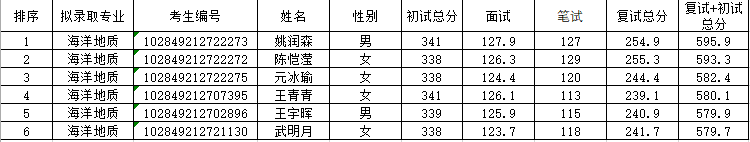 根据《2019南京大学地海院硕士生复试录取工作细则》,海洋地质专业拟接收报考51吃瓜 自然地理学专业调剂考生6人,现将拟录取名单公示如下: